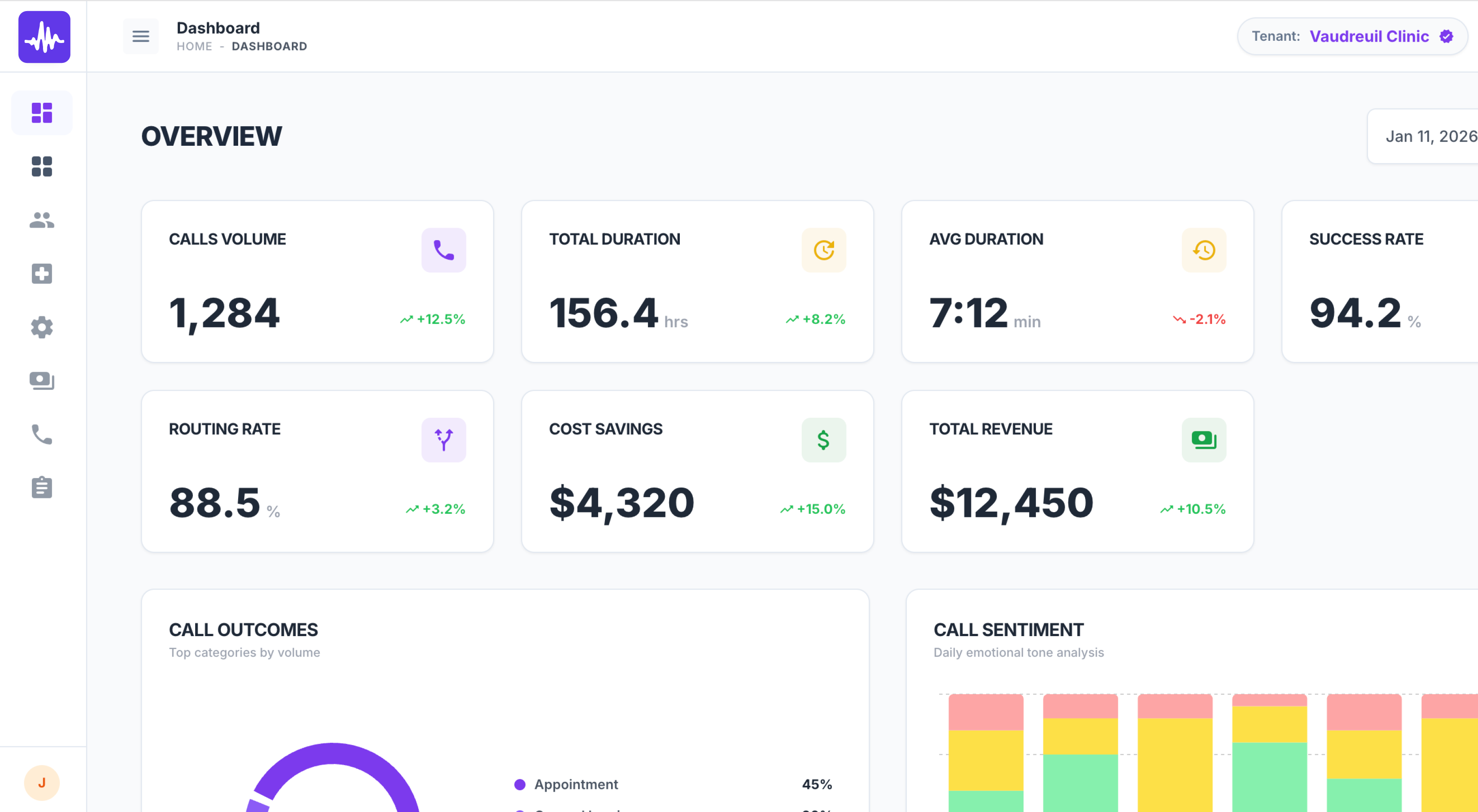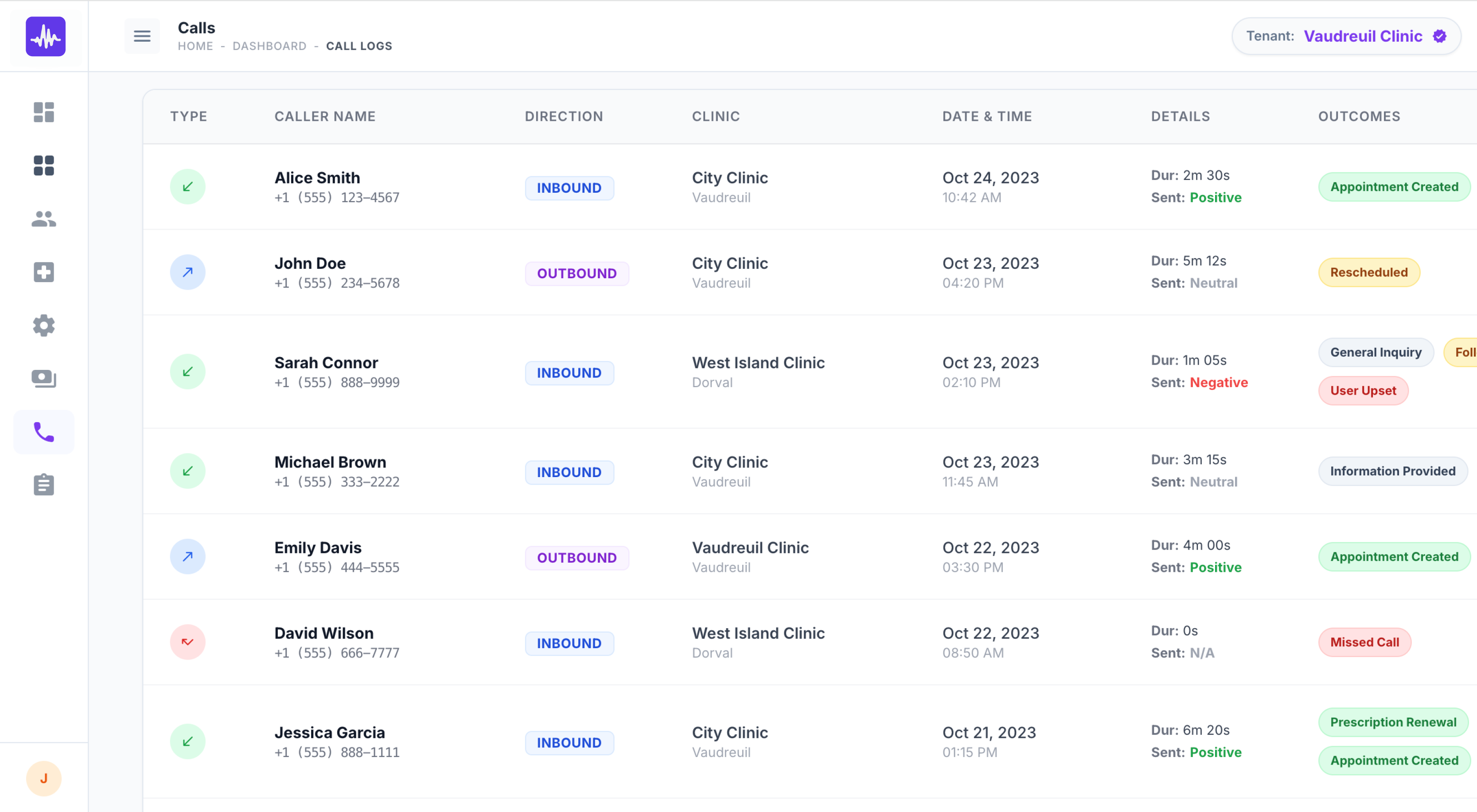 From call volume to average duration and success rates, you can see your clinic’s performance at a glance. Clear summaries of call outcomes and sentiment help you quickly prioritize follow-ups and address any issues.