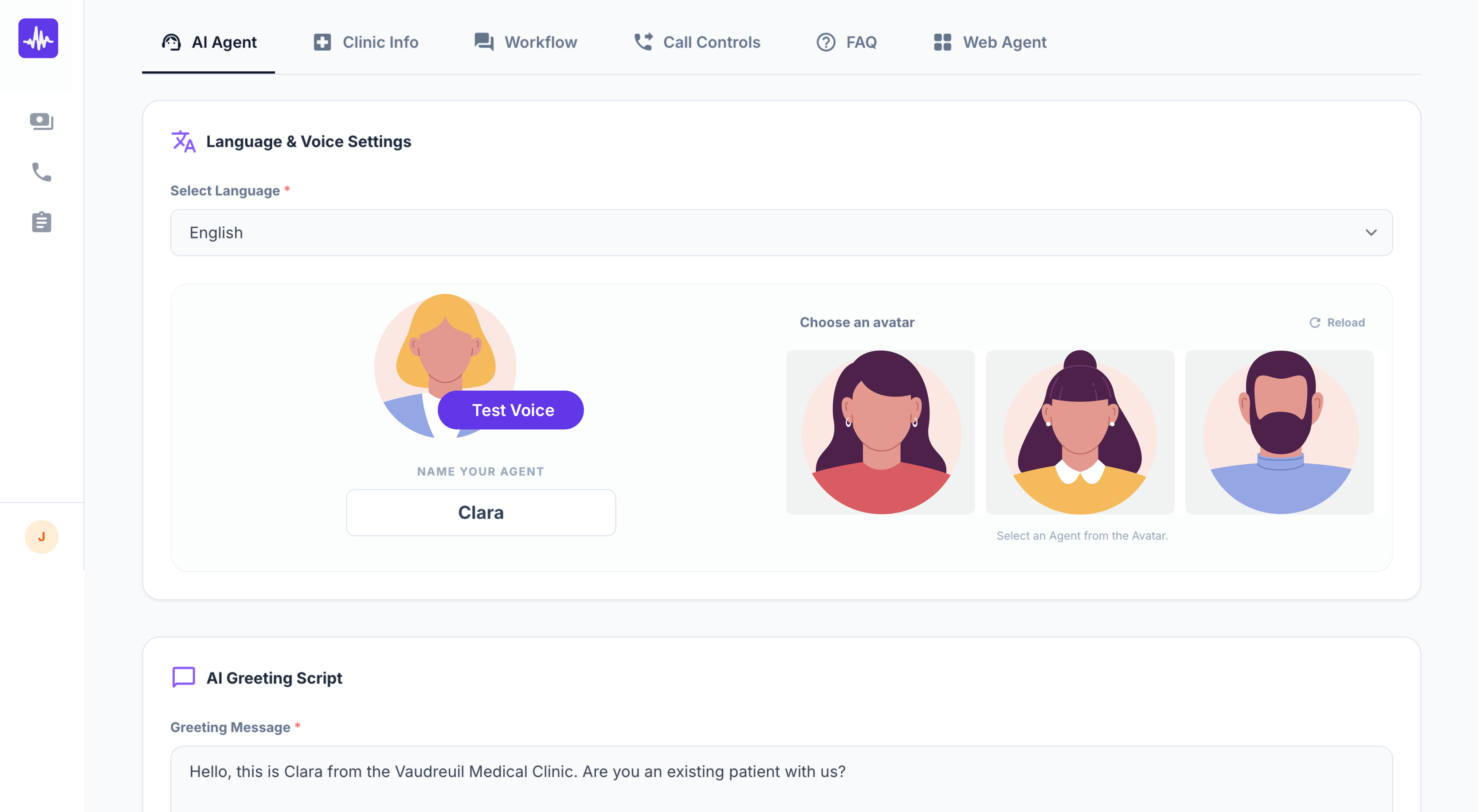 Choose the persona, tone, voice, and accent that best align your environment. You can also update policies or information at any time, with changes applied instantly so patients always receive accurate answers.
