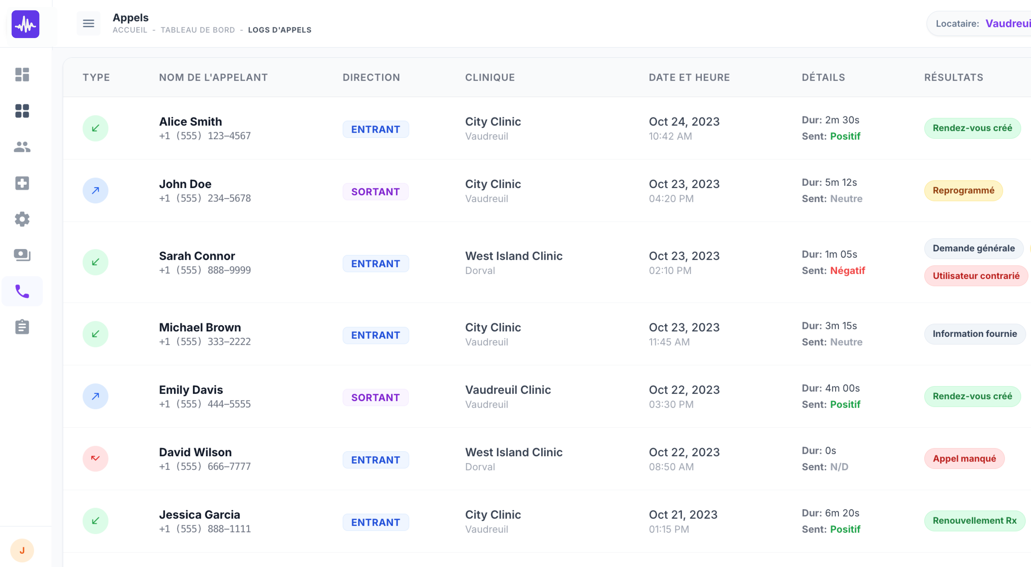 Du volume d’appels à la durée moyenne et aux taux de réussite, visualisez le rendement de votre clinique en un coup d’œil. Des résumés clairs vous aident à prioriser les suivis et à repérer rapidement les enjeux.