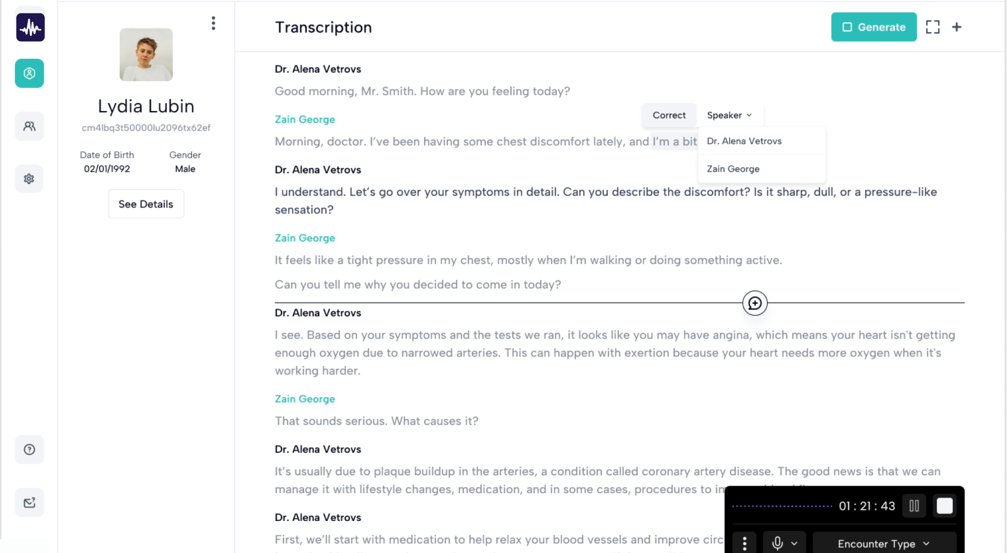 Transcribe patient conversations live, the moment they happen. Medical terminology is recognized, speakers are distinguished, and every detail is preserved throughout the encounter, without any manual input from you.
